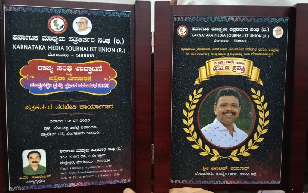 ಕರ್ನಾಟಕ ಮಾಧ್ಯಮ ಪತ್ರಕರ್ತರ ಸಂಘ (ರಿ) ಬೆಂಗಳೂರು ಇದರ ವತಿಯಿಂದ ಈ ಪ್ರಶಸ್ತಿಯನ್ನು ನೀಡಿ ಗೌರವಿಸಲಾಗಿದೆ. ತುಮಕೂರು ನೊಣವಿನ ಕೆರೆ ಶ್ರೀ ಕಾಡು ಸಿದ್ದೇಶ್ವರ ಸಂಸ್ಥಾನ ಮಠದ ಶ್ರೀ ಡಾ. ಕರಿ ವೃಷಭ ದೇಶಿ ಕೇಂದ್ರ ಶಿವ ಯೋಗೀಶ್ವರ ಮಹಾಸ್ವಾಮಿಗಳು, ಹೊರನಾಡು ಅನ್ನ ಪೂರ್ಣೇಶ್ವರಿ ದೇವಸ್ಥಾನದ ಧರ್ಮದರ್ಶಿ ಭೀಮೇಶ್ವರ ಜೋಷಿ, ಅವದೂತರಾದ ವಿನಯ್ ಗುರೂಜಿ, ಬೇರು ಗುಂಡಿ ಬ್ರಹನ್ಮಠದ ರೇಣುಕ ಮಹಾಂತ ಶಿವಾಚಾರ್ಯ ಸ್ವಾಮಿಗಳು , ಅರಣ್ಯ ಸಚಿವ ಈಶ್ವರ ಖಂಡ್ರೆ, ಮುಖ್ಯ ಮಂತ್ರಿಗಳ ಮಾಧ್ಯಮ ಸಲಹೆಗಾರ ಕೆ. ವಿ. ಪ್ರಭಾಕರ್, ರಾಜ್ಯ ಪರಿಸರ ಮೌಲ್ಯ ಮಾಪನ ಪ್ರಾಧಿಕಾರದ ಅಧ್ಯಕ್ಷ ಎ. ಎನ್. ಮಹೇಶ್, ಮಾದ್ಯಮ ಅಕಾಡೆಮಿ ಅಧ್ಯಕ್ಷರಾದ ಆಯೇಶಾ ಖಾನಂ, ಉಚ್ಚ ನ್ಯಾಯಾಲಯದ ನ್ಯಾಯವಾದಿ ಹಾಗೂ ಕಾನೂನು ಸಲಹೆಗಾರರಾದ ಅಮ್ರತೇಶ್, ಮಾಧ್ಯಮ ಪತ್ರಕರ್ತರ ಸಂಘದ ರಾಜ್ಯ ಅಧ್ಯಕ್ಷರಾದ ರಾಜಶೇಖರ್, ಉಪಾಧ್ಯಕ್ಷರಾದ ಡಾ. ರವೀಂದ್ರ ಶೆಟ್ಟಿ, ಇನ್ನೋರ್ವ ಉಪಾಧ್ಯಕ್ಷರಾದ ಟಿ. ಪಿ ಕೃಷ್ಣನ್ ಮತ್ತಿತರರ ಉಪಸ್ಥಿತಿಯಲ್ಲಿ ಈ ಪ್ರಶಸ್ತಿ ನೀಡಲಾಯಿತು.